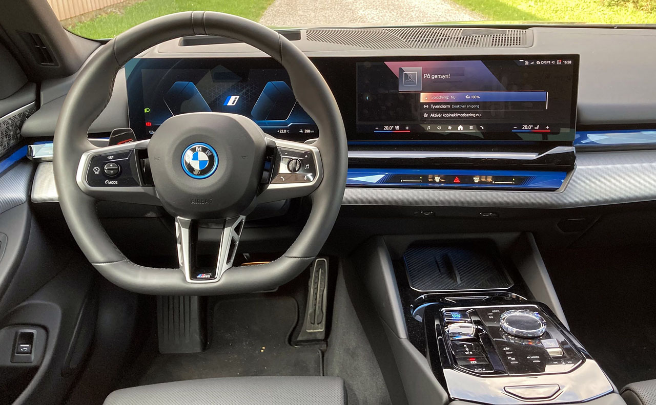 To sammenhængende digitale displays, kaldet Curved Display, på henholdsvis 14,9 og 12,3 tommer dominerer i5-førerens synsfelt. Men trods al ny teknologi er dét at tage plads i BMW-førersædet som at komme hjem i sin bedste stol.