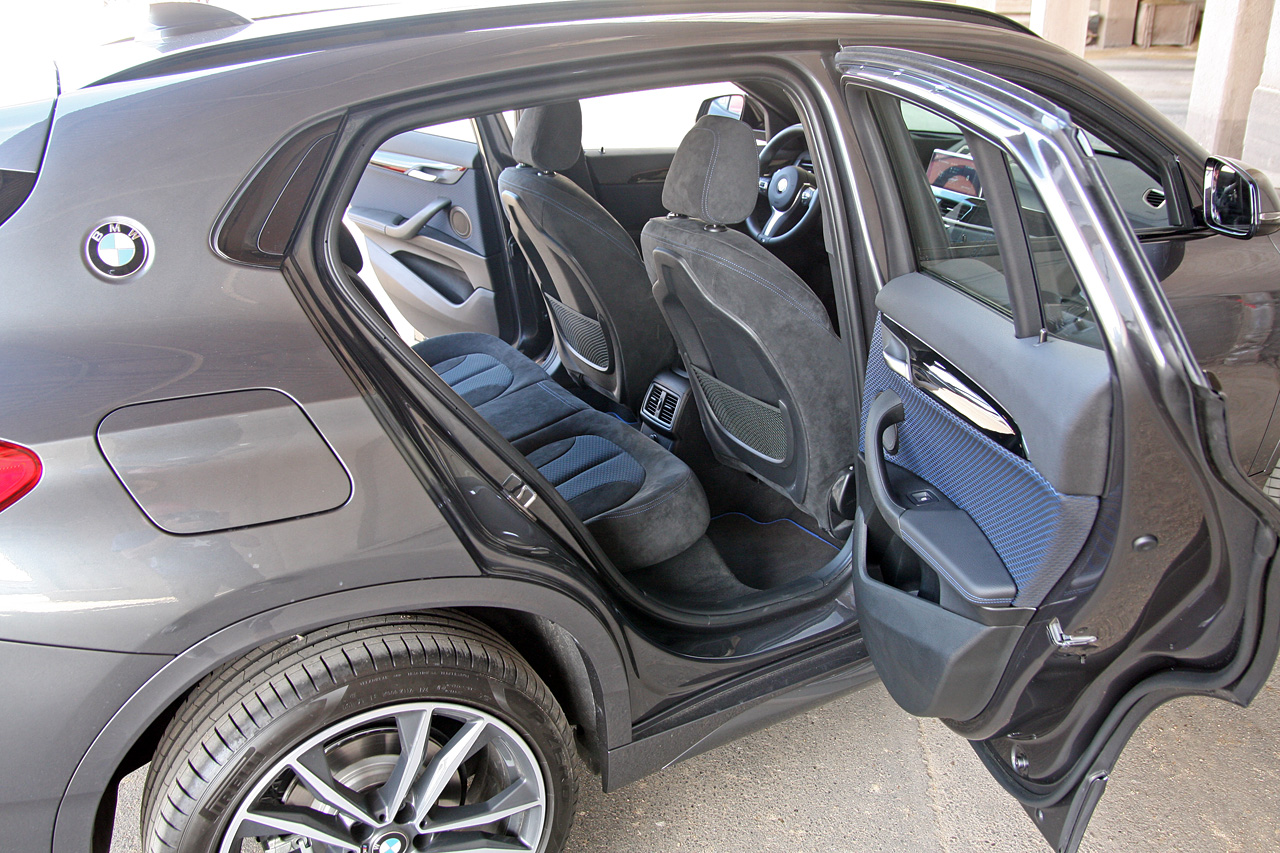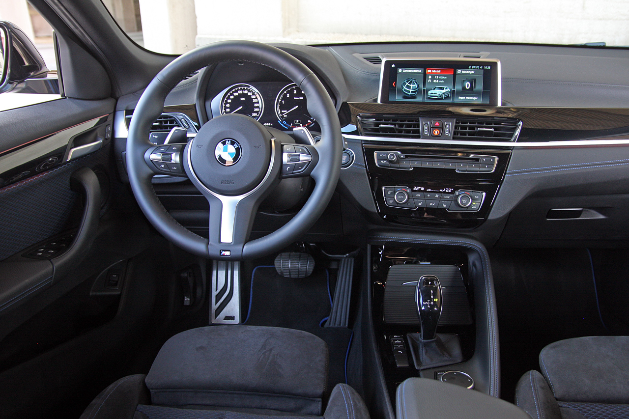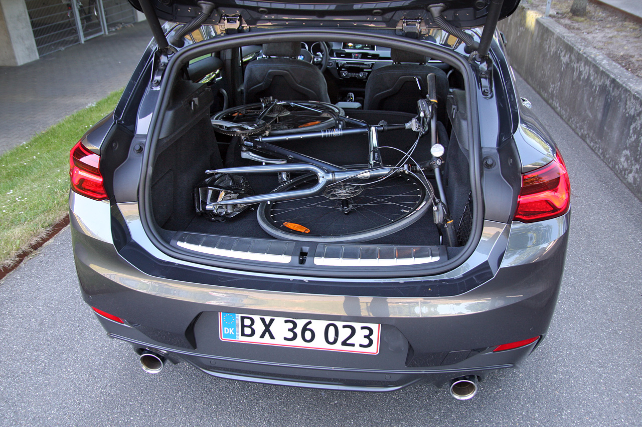 Overraskende rummelig. Fra X1 har X2 arvet samme akselafstand og den tværstillede motor giver langt bedre plads i kabinen, end vi f.eks. er vant til fra den baghjulstrukne 1-serie. X2 føles bare mere intim end X1, fordi taget er lavere og sideruderne mindre. Det hæmmer udsynet bagud og til siderne, men man skal ikke lade sig narre; X2 er rigeligt stor til at løfte opgaven som familiebil, også på den lange ferietur. Bagagerummet sluger nemlig 436 liter, og er det ikke nok, kan det tredelte bagsæde foldes frem i forholdet 40:20:40. En fiks feature, der endda er standard. Fit og finish er også i orden. Der er masser af bløde plastmaterialer i X2, men typisk for BMW er instrumentpanelet sat sammen af mange dele. Det er ikke altid lige kønt, men funktionaliteten er høj – f.eks. sætter vi pris på, at ventilation betjenes direkte med intuitive greb og knapper.