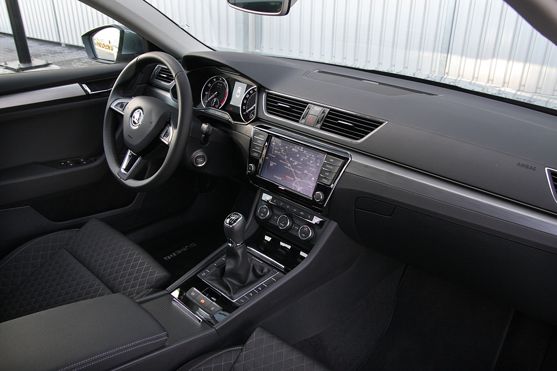 Førerpladsen er det sted, hvor der er mindst forskel på Superb og forlægget Passat. Fint med os, for dermed får du en førerplads med fremragende ergonomi og en betjening præget af tysk logik. Pladsen er overdådig, for Superb er et par cm bredere end Passat i kabinen. Finish og samlekvalitet er på samme, høje niveau – at Superb er godt 20.000 kr. billigere end en tilsvarende Passat skinner ingen steder igennem. Hvilket også ville være mærkeligt, da begge biler benytter sig af samme komponenter, helt ned til de mindste knapper og betjeningsgreb.