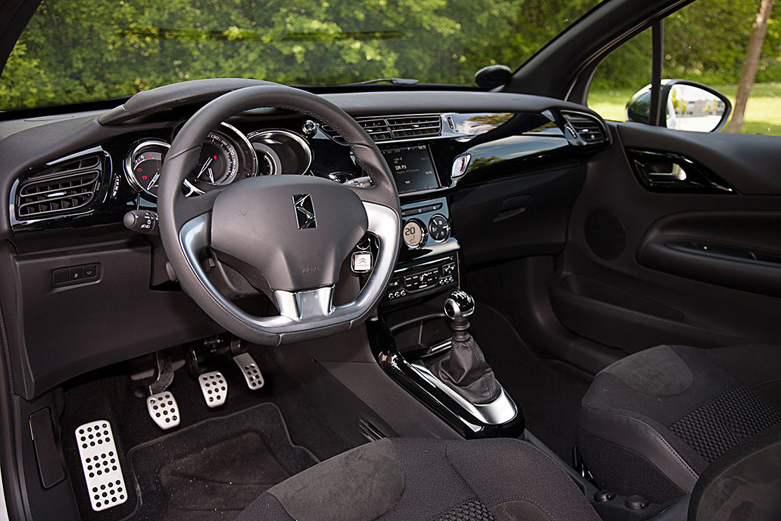 Interiørets grundlæggende layout deler DS3 med den mere ordinære C3, men i premium-bilen har materialer og antallet af gimmicks fået et nøk opad. Med faceliftet følger endnu flere kulørte lamper end hidtil. Førerpositionen er ikke perfekt for langbenede, men indstillingsmulighederne for rat og sæde er tilstrækkelige. Ved at trække taget langt frem og gøre forruden stejl genskaber Citroën noget af den intime skydeskårs-fornemmelse, som vi kender fra forbilledet Mini.