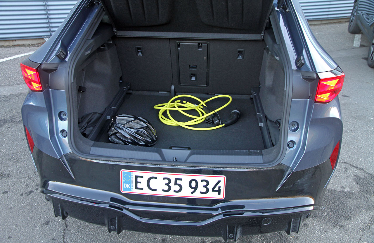 Med sin lave taglinje er der mindre plads i Tavascan end de praktiske søsterbiler VW ID.4 og Skoda Enyaq. Grundlæggende er bilen dog effektivt udhulet, og med det helt flade gulv kan der sagtens sidde tre langlemmede teenagere på bagsædet. Også bagagerummet er stort og regulært og kan indrettes med gulv i to højder. Et lille kælderrum har plads nok til ladekabler, men vi ville foretrække et frunk foran, som Cupra ikke har fundet plads til.