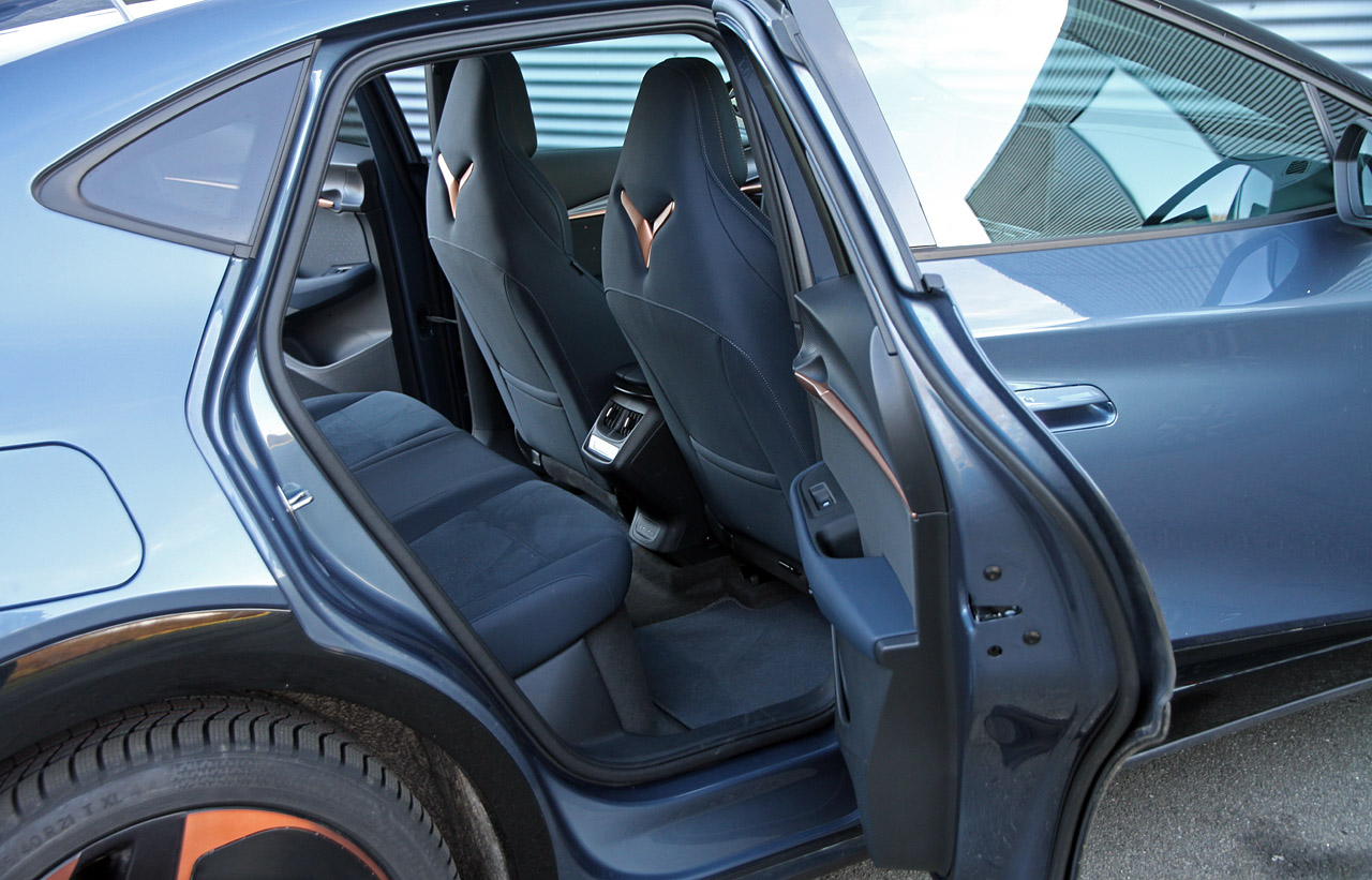 Finishen placerer sig et sted mellem den semi-lækre Skoda Enyaq og mere rustikke VW ID.4/5. Særligt de eldrevne sportssæder i alcantara er lækre og helt skulpturelle i deres form med flot integrerede hovedstøtter. Bare ærgerligt, at førersædet i testbilen rokkede lidt. Formentlig skyldes det bare en løs bolt.