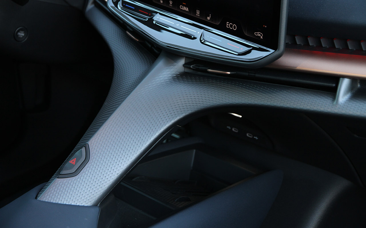Den T-formede ’rygrad’, der løber mellem sæderne og op mod instrumentpanelet er dog mere spøjs end smuk. Faktisk er den i mest i vejen, og man kan se på lang afstand, at den er lavet i hård plastic.