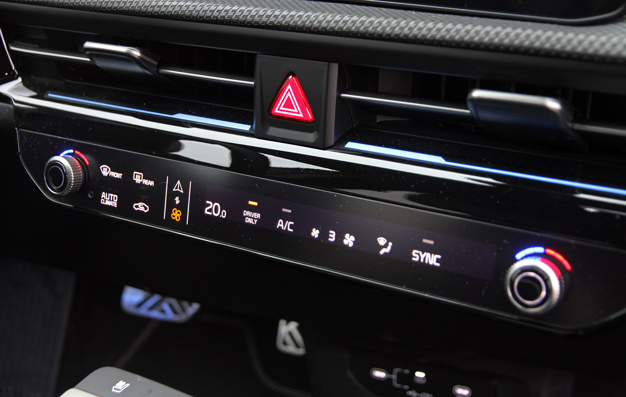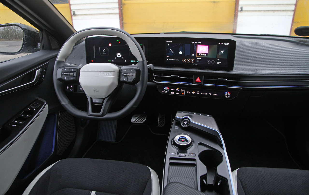 To 13-tommers skærme i bueform, nyt rat med masser af fysiske knapper og en svævende midterkonsol med drejehjul til gearkassen og trådløs opladning af mobilen: Også i kabinen er EV6 fortsat helt fremme på teknik-beatet. Men tag ikke fejl. Førerpladsen er velfungerende og softwaren virker up-to-speed. Dog kunne grafikken være en my skarpere og selv om der er en genvejstast i rattet, er det omstændeligt at justere eller slukke for nogle af de mange sikkerhedsassistenter. Eksempelvis træthedsovervågningen, der er emsig som i en kinesisk elbil.