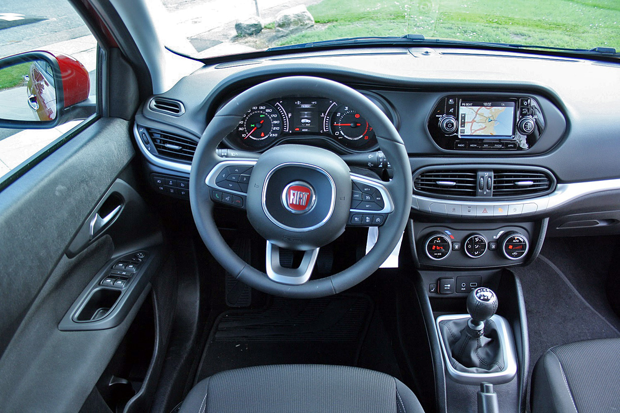 Vi har dog en håndfuld ankepunkter, som forhindrer, at Fiat Tipo udmærker sig i klassen: Instrumenterne er for utydelige og upræcise i grafikken, 5,5" touchskærmen er for lille og gnidret efter nutidens målestok, 7" er først standard i Lounge-udstyret, der er store mængder hård plast på både instrumentbord og dørsider, ligesom finishen er gennemsnitlig. Til gengæld virker det godt skruet sammen; vi hørte ingen knirkelyde i løbet af testugen.