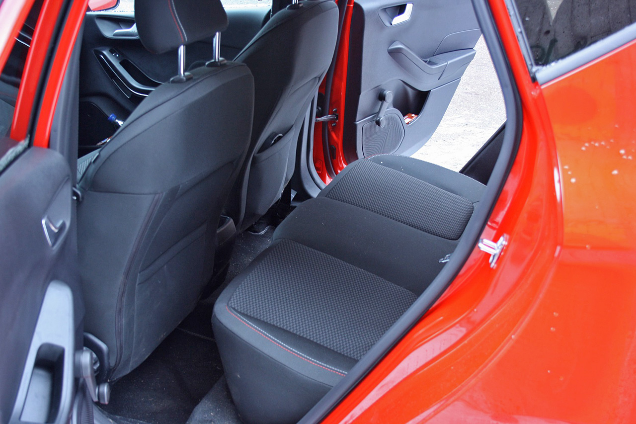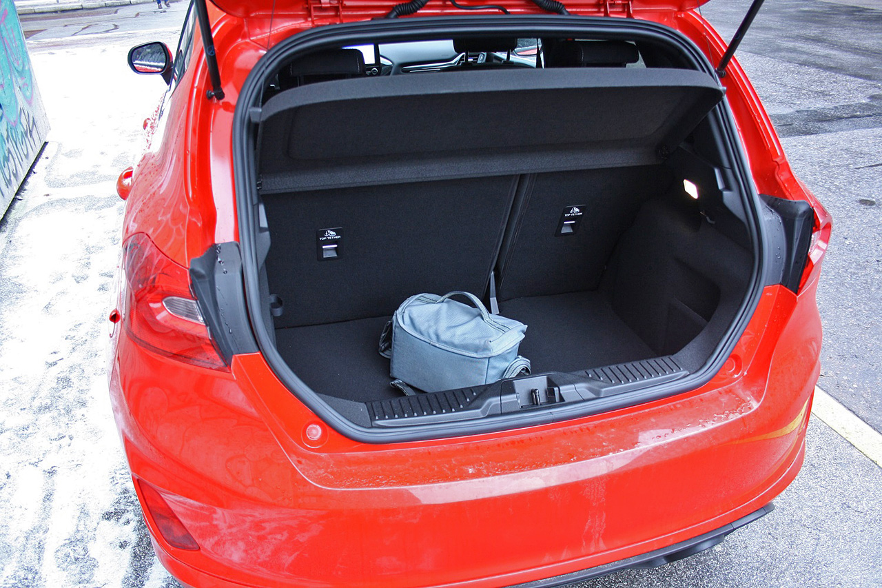 Rummelig. Det kan godt være, at bredde, længde og ikke mindste akselafstanden mellem de to hjulsæt er næsten identiske for den nye Fiesta og forgængeren, men Fords indretningsfolk har gjort et fint arbejde med at udhule karosseriet og skabe mest mulig plads inden døre. Fiesta har ca. 6 cm kortere mellem de to hjulsæt end den hårdeste konkurrent, den nye VW Polo, men i daglig brug er der ikke nævneværdig forskel. Vi var tre voksne, en teenager og et otte-årigt barn på weekendtur i testugen, og vi savnede egentlig ikke plads. Et sted er der dog mærkbar forskel - selv om bagagerummet er vokset lidt i Fiesta, så har Polo ca. 50 liter mere bagagerum. Et par andre minusser i den nye Fiesta er meget begrænset udsyn skråt bagud, og så er det svært for mindre børn at kigge op over de høje dørsider.