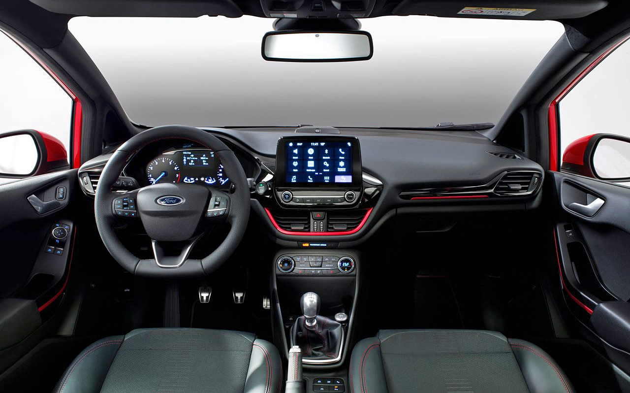 Bag rattet er den nye Fiesta ret indbydende. I forhold til forgængeren er meget forbedret, men den meste markante ændring er et nyt, svunget layout af instrumentbordet. Der er ryddet godt og grundigt ud i de mange knapper i forgængeren, og en række funktioner er i tidens ånd samlet i den 6,5 tommer store touchskærm, som er godt placeret centralt og højt på instrumentbordet. Desværre betyder det, at friskluftdyserne er placeret underligt lavt. Øverste del af instrumentbordet er med blød beklædning, mens den øvrige plast er hård. Det basale er også helt i orden i den nye Fiesta. Sæderne er gode og kan ligesom rattet indstilles i højde og længde, så høj som lav kan opnå den rette kørestilling. Og selv om man er langbenet, når højre arm let gearvælgeren til den sekstrins gearkasse.