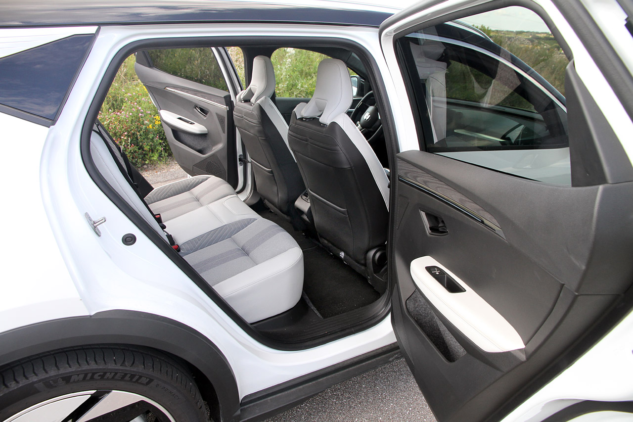 Med en længde på 447 cm er Scenic E-Tech en kvart klasse mindre end konkurrenterne. Til gengæld er den effektivt udhulet. De blot 27 ekstra cm i forhold til lillesøster Megane gør underværker. Også på bagsædet, hvor du sidder glimrende med god plads i alle retninger. Du forkæles med drejelige kopholdere, der også holder styr på blyanter og mobiltelefoner, flere lommer bag på forsæderne og støjdæmpende filt i de store dørlommer. Overfladerne er nydelige, og de franske indretningsarkitekter arbejder med genbrugsmaterialer, der giver en varm, hjemlig atmosfære i kabinen. Tjek for eksempel den næsten fleece-agtige loftsbeklædning i en lækker koksgrå kulør. Tres bien! Så lever vi med, at plasticen sine steder faktisk er af den hårde slags, for man skal trykke på den for at opdage det.