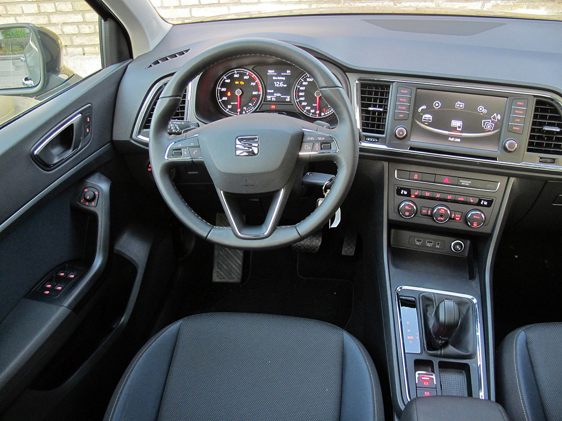 Helt klassisk Volkswagen-gruppen, som Seat er en del af, og meget lig Seat Leon - dog med en lidt højere siddeposition. Her er snorlige linjer, fin finish og gode pladsforhold. Teknikken er kendt fra VW-koncernens hylder. Der er intet nyt under solen eller spansk vovemod bag layotet i Seat Ateca, men det hele fungerer som det skal, og chauffører i alle størrelser kan finde sig godt til rette her og få serveret spansk køreglæde. Sæderne er typisk tyske - faste i betrækket med et godt greb om kroppen.
