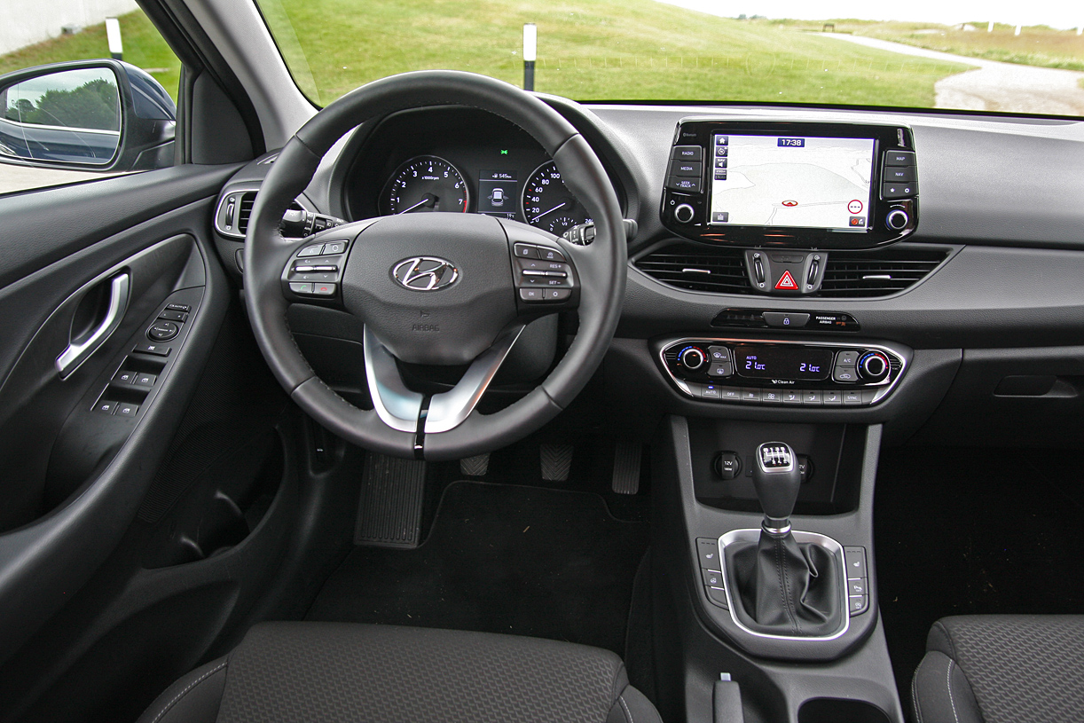 Nøgtern og logisk som i en – rigtigt gættet – Golf. Instrumenterne er blottet for pjank og står bare krystalklart med hvide tal på sort baggrund, mens betjeningsgrebene til ventilationsanlægget nu er placeret vandret i stedet for lodret. Sådan er det også i en Golf – og det ser mere eksklusivt ud. Ny er også en ’svævende’ og velfungerende touch-skærm på otte tommer, der følger med i de to topudgaver Trend og Premium – ellers må du nøjes med en mere beskeden fem tommers skærm. Ergonomien – altså forholdet mellem rat, sæde og pedaler – passer til store skandinaver, og mens finishen virker noget standardpræget, slipper du til gengæld for irriterende knirkelyde. Hyundai i30 efterlader ingen tvivl om, at den vil tages alvorligt.