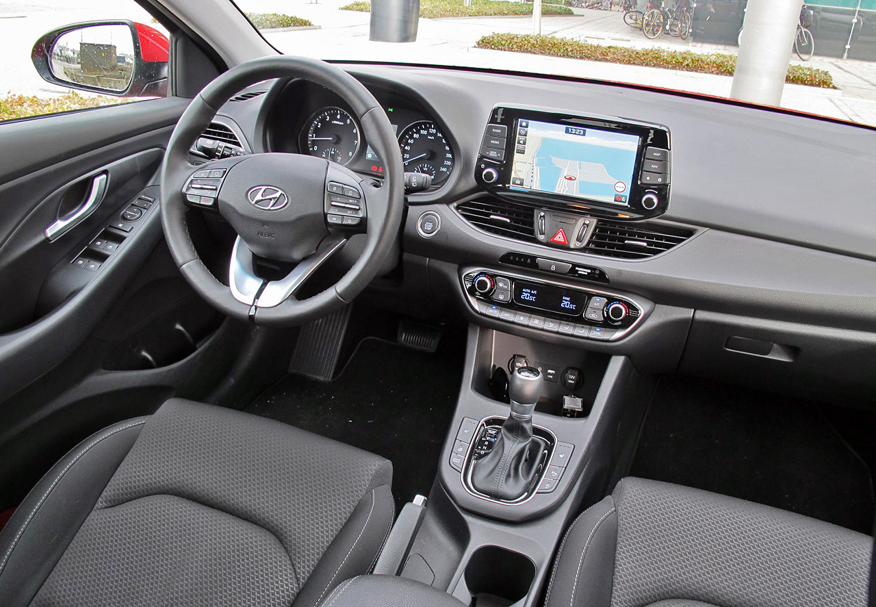 Spændende vil vi ikke just kalde førerpladsen i Hyundai i30, men den virker. Ergonomi og betjening er i orden, og den otte tommers touch-skærm fungerer fint og kvikt - perfekt placeret øverst på instrumentbordet.
