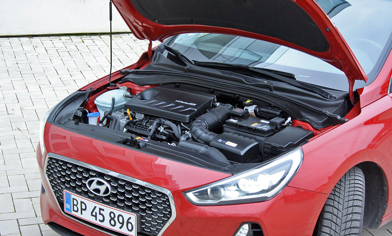 Som et urværk. Den 1,4 liters turbobenzinmotor med 140 hk gør ikke et meget væsen af sig under arbejdet med at flytte den relativt store bil. Den arbejder tyst og kultiveret og samarbejdet med det 7-trins automatgear med dobbeltkobling er yderst vellykket. Trods merprisen på 20.000 kr. ville vi vælge denne løsning, for det passer perfekt til i30's DNA, at cruise af sted og lade elektronikken skifte selv. Det maksimale drejningsmoment på 242 Nm er til stede allerede fra 1.500 omdrejninger/minut, og det betyder, at du aldrig savner kræfter. Vi endte på et snit på 14,0 km/l efter en testuge med mest motorvej, og det er bestemt acceptabelt i forhold til det opgivne forbrug på 18,2 km/l efter den ikke særligt realistiske, NEDC-norm, som snart afløses af den mere virkelighedsnære WLTP-norm.