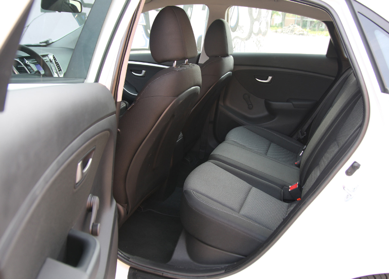 Foran er der god bredde og højde, mens den markante kileform gør de bagerste sideruder lidt små, særligt for børn, der gerne vil kigge ud. Pladsen på bagsædet fejler ikke noget – i30 har stort set samme benplads her som klasseduksen Golf. Man sidder dog lidt dybere med mindre støtte til lårene. Med 378 liter er det regulære bagagerum blandt klassens største, og bagklappen smækker med et tillidsvækkende svup.