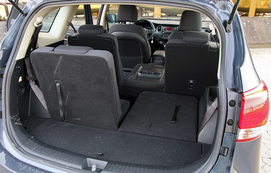 Ganske indbydende. Finishen er en blanding af hård og blød plastic, men alt er samlet pænt og ordentligt og efterlader en god fornemmelse af, hvorfor Kia giver hele 7 års garanti. Sæderne støtter godt – også på 2. række. Omvendt er de lavt placeret, så langbenede passagerer savner støtte under lårene. Som i mange andre mellemstore MPVere er de to sidste siddepladser på 3. række absolut kun for børn. Benpladsen er beskeden – og det kræver akrobatiske evner at kravle derom. Familiens mindste synes bare det er sjovt, men bedstemor kan du godt glemme at få bugseret ind på række 3.