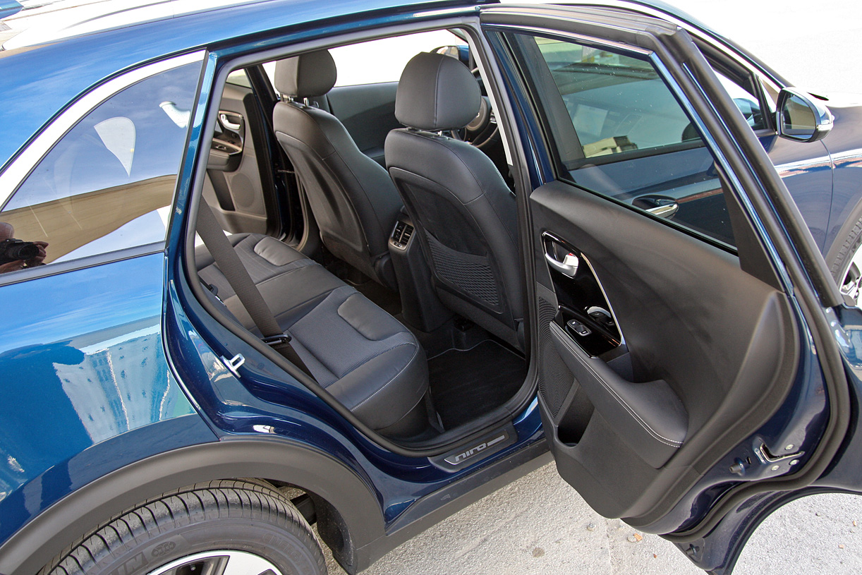 Mere rummelig end man skulle tro for en bil på moderate 436 cm. Både for og bag er der masser af luft omkring hoved, albue og knæ – fem voksne kan sagtes drage på langtur i den gæstfri Niro. Batteriet er godt gemt væk under bagsædet, men gulvet i bagagerummet så højt, at det kun sluger 427 liter. Lægger du splitbagsædet ned er gulvet dog næsten plant, og sammen med den lodrette bagklap er det nemt at få det maksimale ud af Niros bagagerum. Finish og kvalitetsindtryk er typisk Kia. Her er hård plastic hist og pist, men knapperne klikker lækkert og du slipper for de raslelyde, du ofte hører i dyrere, tyske biler.