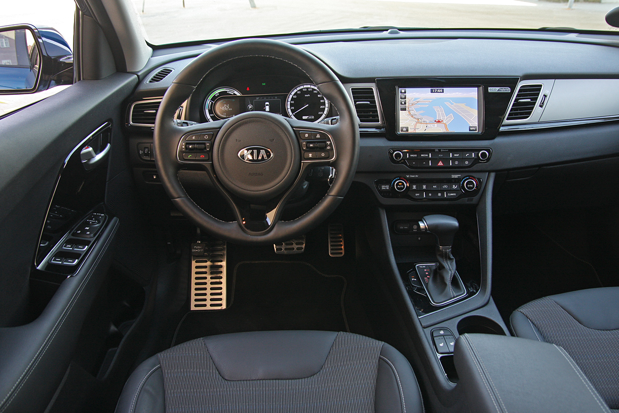 Uden at være høj som en SUV får førerpladsen et løft i Niro. Det giver et godt udsyn, og gør det let at stige ind og ud. Forholdet mellem rat, sæde og pedaler er i orden, men desværre er selve sædet kort og da ryglænet samtidig kun kan indstilles i grove hak, fandt vi os aldrig helt til rette i førersædet. Betjeningen er til gengæld let at finde rundt i – inklusive det multiinstrument der på forskellige måder viser, hvor miljøvenligt du kører. For eksempel kan du se, hvor stor en procentdel af din kørsel, der er økonomisk, din aktuelle brændstoføkonomi og om du får energi fra benzinmotoren, batteriet eller begge dele. Pædagogisk underholdning der gør det til en sport at spare.