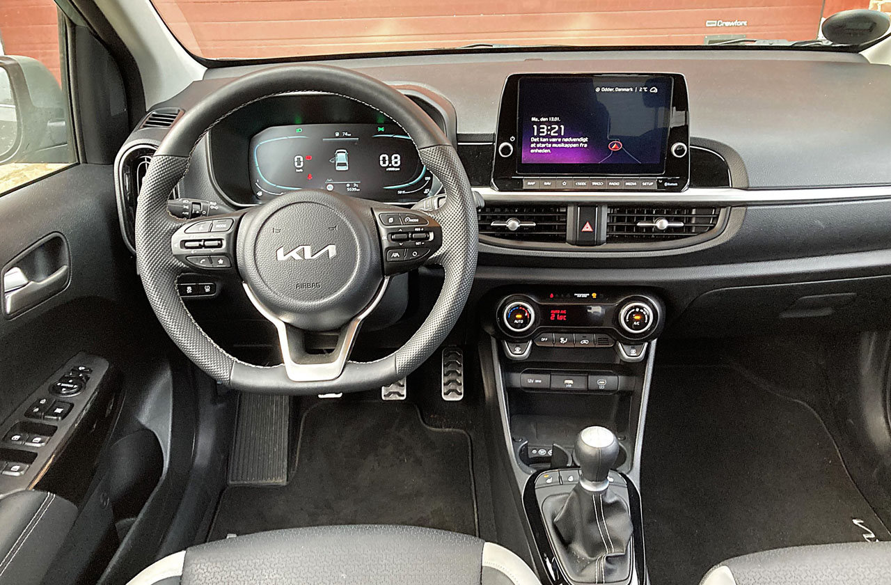 Picanto virker godt skruet sammen, selvom hård plastik af indlysende årsager er fremherskende. Sæderne i GT-Line ser lidt fiksere ud end i de andre, men de er lidt korte og lidt for flade til, at en 188 centimeter høj dansker er klar til at kaste sig ud i et længere eventyr bag rattet. Med til de forbehold hører, at rattet kun kan justeres i højden og ikke kan trækkes tættere på.
