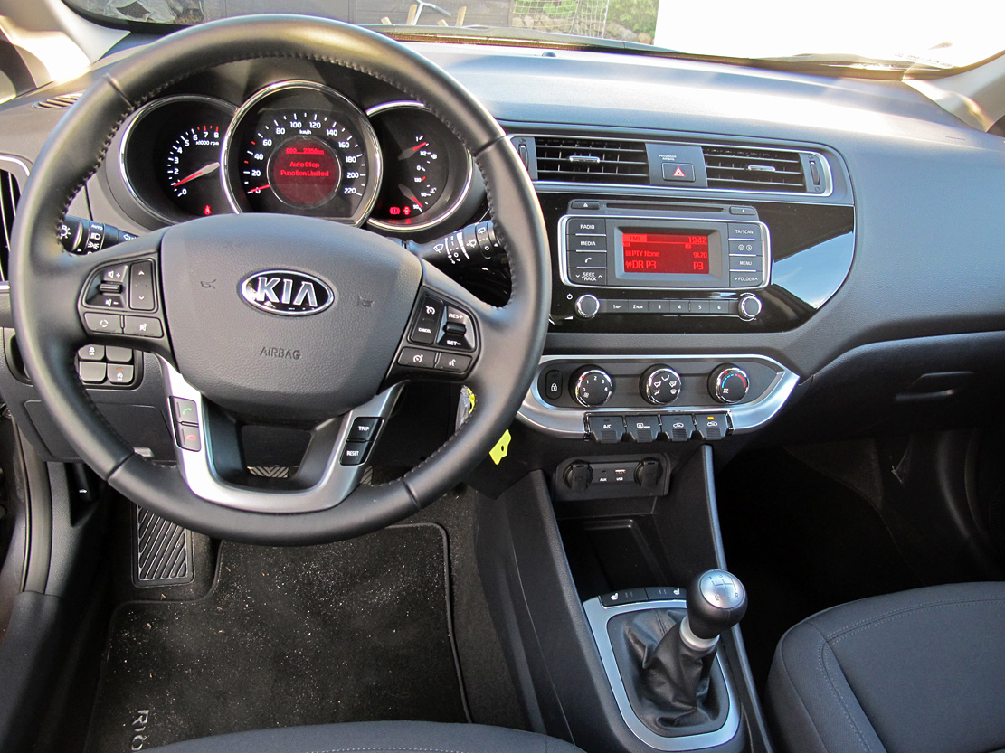 Kia Rio nøjes med en lille info-skærm - medmindre du vil betale 12.000 kr. for en 7" skærm med bakkamera og navigation. Bag rattet sidder selv høje personer lavt men godt i faste, velformede sæder. Armlæn mellem forsæder og fralæggeplads specielt designet til en smartphone er gode detaljer.