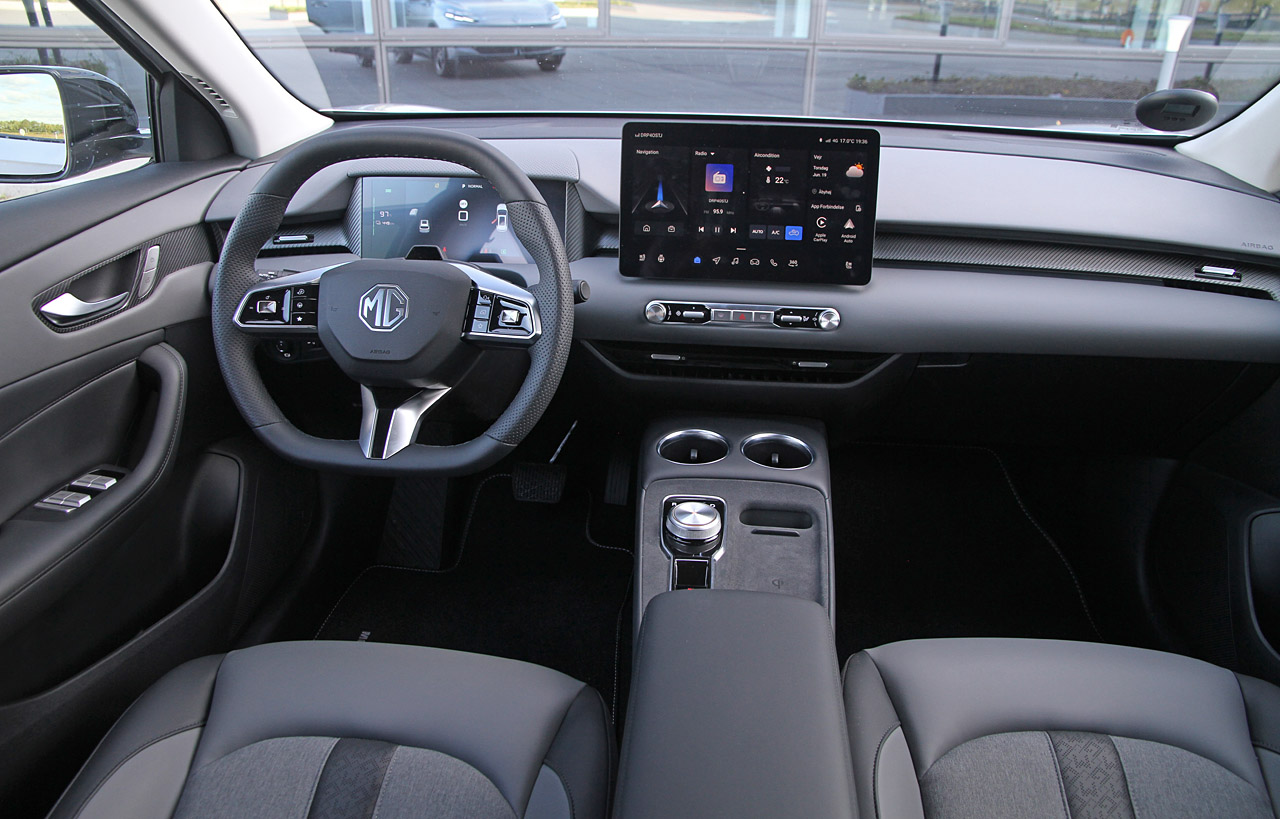 Sammenlignet med den MG 4, som S5 deler teknik med, fremstår førerpladsen både mere indbydende og ryddelig. Den centrale touchskærm kan indeholde flere funktioner på én gang, hvilket faktisk letter betjeningen. Det gælder også muligheden for at samle alle de advarsler om træthed, fartoverskridelser osv., som man ikke vil forstyrres med i én funktion, der så kan deaktivere dem alle på én gang med to tryk på skærmen. En virkelig fin løsning. Mindre overbevisende er det, at skærmen og speedometeret altid har sort baggrund. Særligt navigationskortet er svært at se i dagslys.