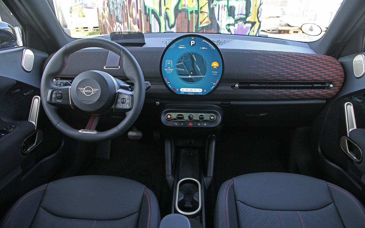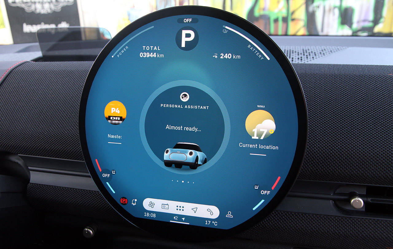 Kabinen er mere Mini end nogensinde med én stor og rund skærm placeret i midten – præcis som i ur-Minien. Nu er det bare ikke et analogt speedometer, men en knivskarp OLED-skærm med lækker grafik og en menu, som du relativt hurtigt bliver dus med. En rimeligt velfungerende stemmestyring og fysiske genvejstaster i både rat og midterkonsol er med til at gøre betjeningen lidt mere ligetil og intuitiv end i mange andre elbiler.