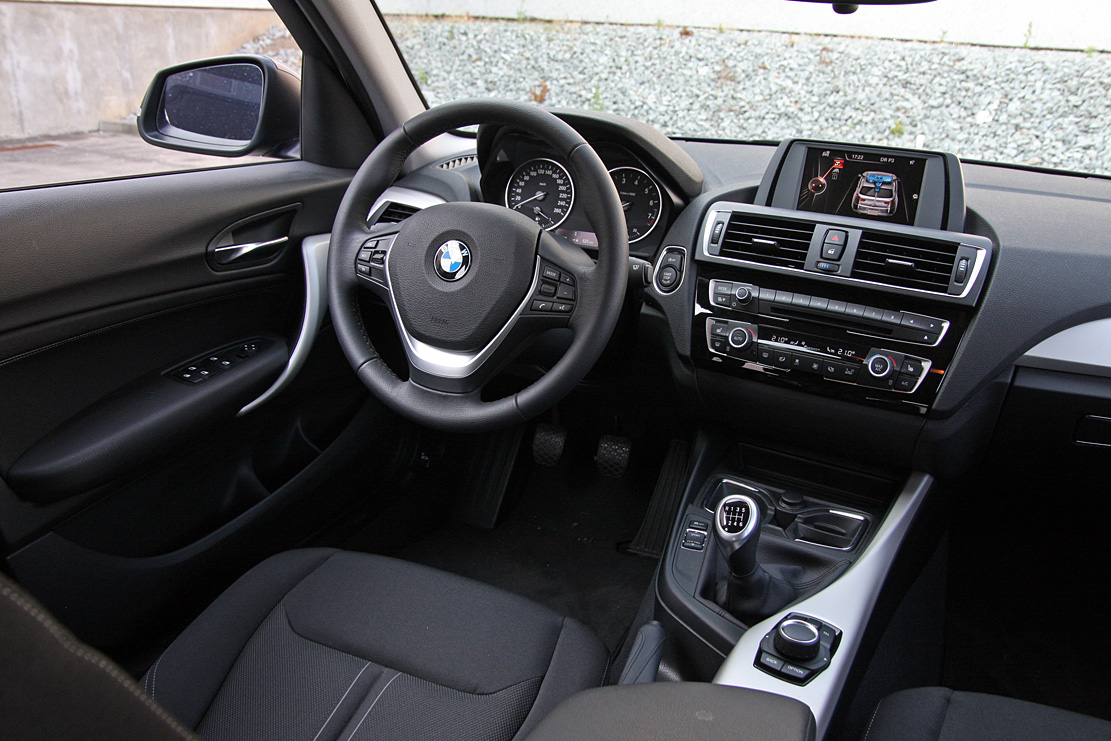 Bortset fra lidt mere krom-pynt rundt om et par af betjeningsgrebene er ansigtsløftet gået sporløst henover BMW 1-serien. Fint med os, for dermed er der dømt klassisk BMW-indretning med tydelige instrumenter, førerorienteret og overskuelig midterkonsol og optimal ergonomi. Man sidder lavt som i en sportsvogn – til gengæld kan selv to-meter mænd finde en perfekt kørestilling. Mens flere konkurrenter er gået over til trykfølsomme skærme, holder BMW fast i joy-stick betjeningen 'i-Drive'. Du skal altså trykke og dreje på en knap for at bladre i menuere, og det er fortsat tids- og opmærksomhedskrævende.