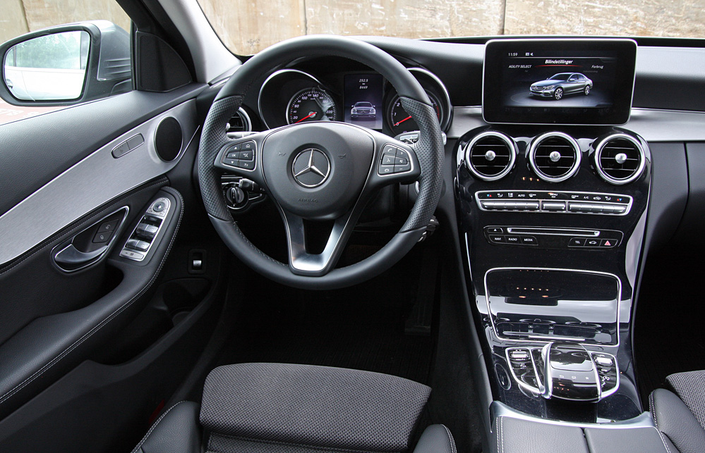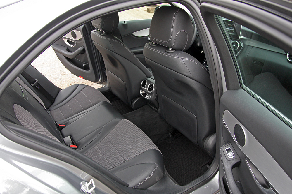 Ser man bort fra den tarvelige midterkonsol, har finishen i den nye Mercedes C-klasse fået et mærkbart løft med bløde, lækre materialer. Vigtigst er dog, at akselafstanden er forlænget med otte centimeter. Dermed rykker bagsædepladsen fra snæver til godkendt – eller nøjagtig lige så god som i BMWs 3-serie, der også rummer to fuldvoksne bagsædepassagerer. Noget raumwunder er Mercedes C dog ikke – som det sig hør og bør i denne klasse kan kabinen bedre sammenlignes med et skræddersyet Hugo Boss jakkesæt: Her ruttes ikke med pladsen, men snittet sidder lige i skabet.
