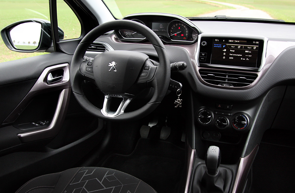 Peugeots nye idé med at placere instrumenterne højt oppe, som du så kigger på hen over et meget lille rat, fungerer glimrende og giver en sportslig go-kart fornemmelse.