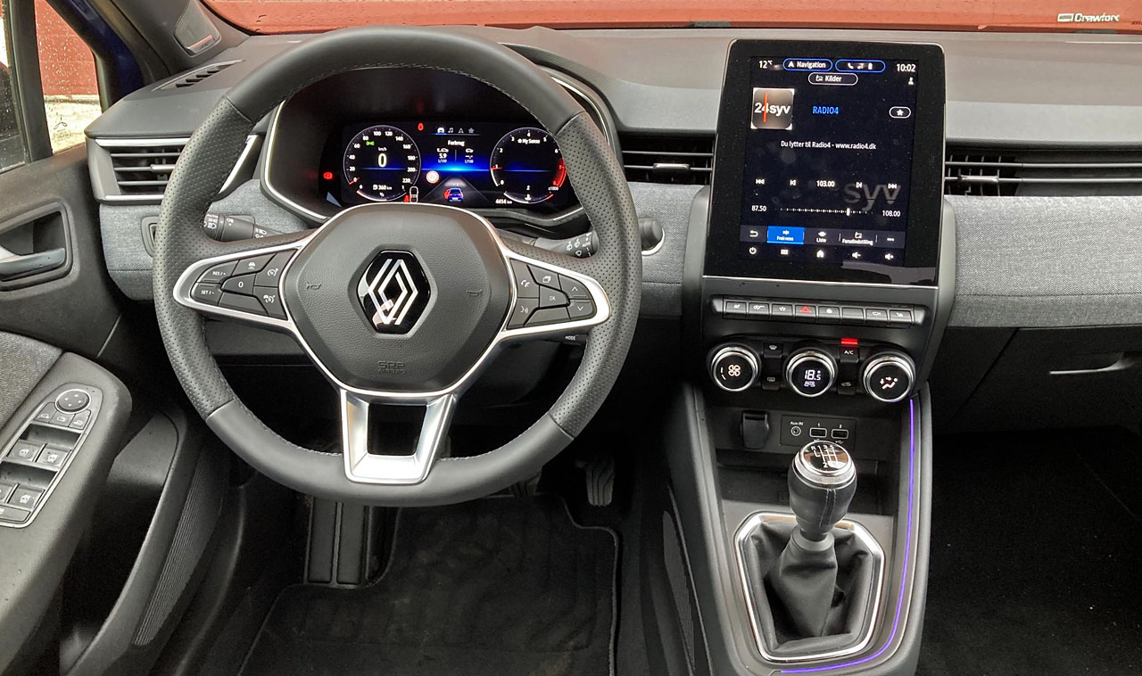 Bag det store, runde Clio-rat er oplevelsen en helt anden. Sæderne er større og støtter bedre, og med numsen i forsædet virker den som en større bil. Storbils-oplevelsen får yderligere et plus for klimaanlægget, der er standard. I de to andre må man nøjes med aircondition. Clios software fungerer kvikkere end 208’erens, og Renault skal have ros for tryk- og drejeknapperne til de mest benyttede funktioner.