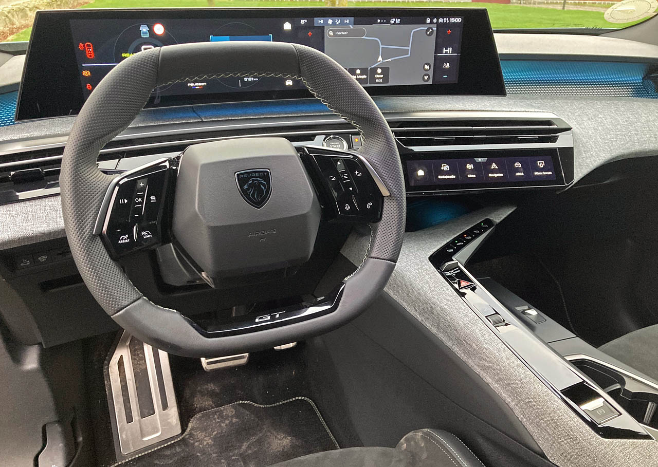 Peugeots særlige i-Cockpit er først og fremmest kendetegnet ved et lille rat. De instrumenter, som føreren skal have mest fokus på, sidder over ratkransen, og i E-5008 udgør førerens skærm sammen med infotainmentskærmen i GT og GT Pack 21 tommer. I Allure og Allure Pack må man tage til takke med to skærme på hver 10 tommer.