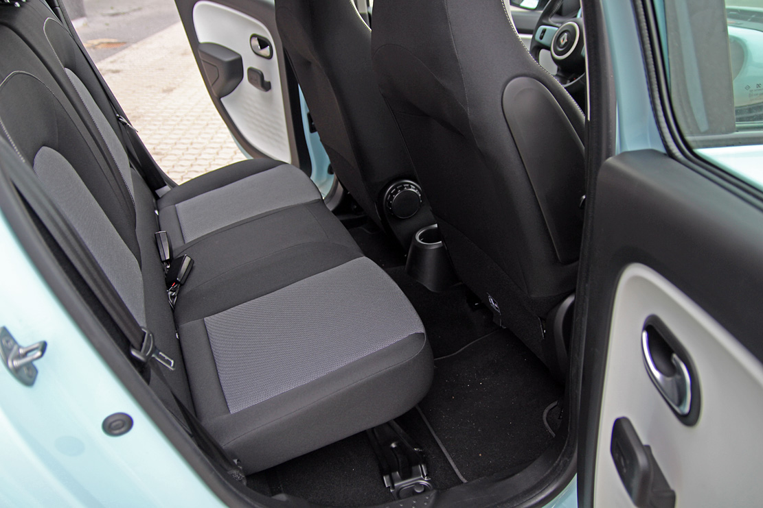 Rummelig – især på bagsædet, der kun fås større i Hyundai i10 i denne klasse. Twingos højde letter ind- og udstigning, og der er masser af aflæggeplads i kabinen. Blandt andet under bagsædet, der dog kun har plads til to personer. Hækmotoren gør, at bagagerummet er højt og lidt dybere og dermed mere regulært end i konkurrenterne. Lægger du splitbagsædet ned, er der ingen kant mellem bagagerum og bagsæde, hvilket gør det lettere at skubbe lange og tunge genstande ind i Twingo. Over alt er det indvendige design præget af runde, bløde former, der giver en venlig atmosfære i den farverige franskmand.
