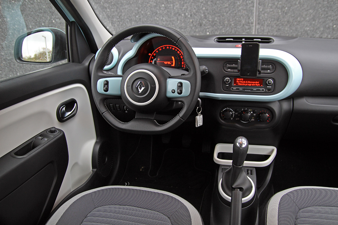 Renault Twingo er den højeste bil i mikroklassen. Den høje siddeposition giver overblik og fornemmelsen af at sidde i en større bil. Sæderne, som Twingo deler med Smart, er da også tysker-stramme i betrækket og støtter godt. Ergonomien er ok med god plads til det højre ben, fordi motoren mangler foran. Omvendt kommer hjulkassen i vejen for venstre ben, så her er ikke mere plads end i klassekammeraterne. Speedometeret er enormt og betjeningen overskuelig, men vi savner en omdrejningstæller. Til gengæld er knapper og drejegreb overraskende solide, selv om flere af dem genkendes fra Renaults discountmærke, Dacia.