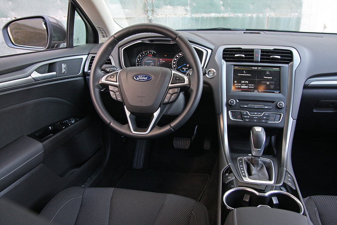 Forbedringerne af Ford Mondeo mærkes især bag rattet, hvor der er blevet ryddet grundigt op i betjeningen. Med testbilens Titanium-udstyr er der elektroniske instrumenter med et væld af oplysninger om alt fra valgt radiostation til kørecomputer. Det er næsten for meget af det gode, og kræver tilvænning før øjnene falder til ro. En stor, trykfølsom skærm i midterkonsollen fungerer til gengæld godt – og vi glæder os over, at finishen har fået et mærkbart løft. Kørestillingen er glimrende i sæder med gode indstillingsmuligheder, f.eks. kan hovedstøtterne også justeres i længden.