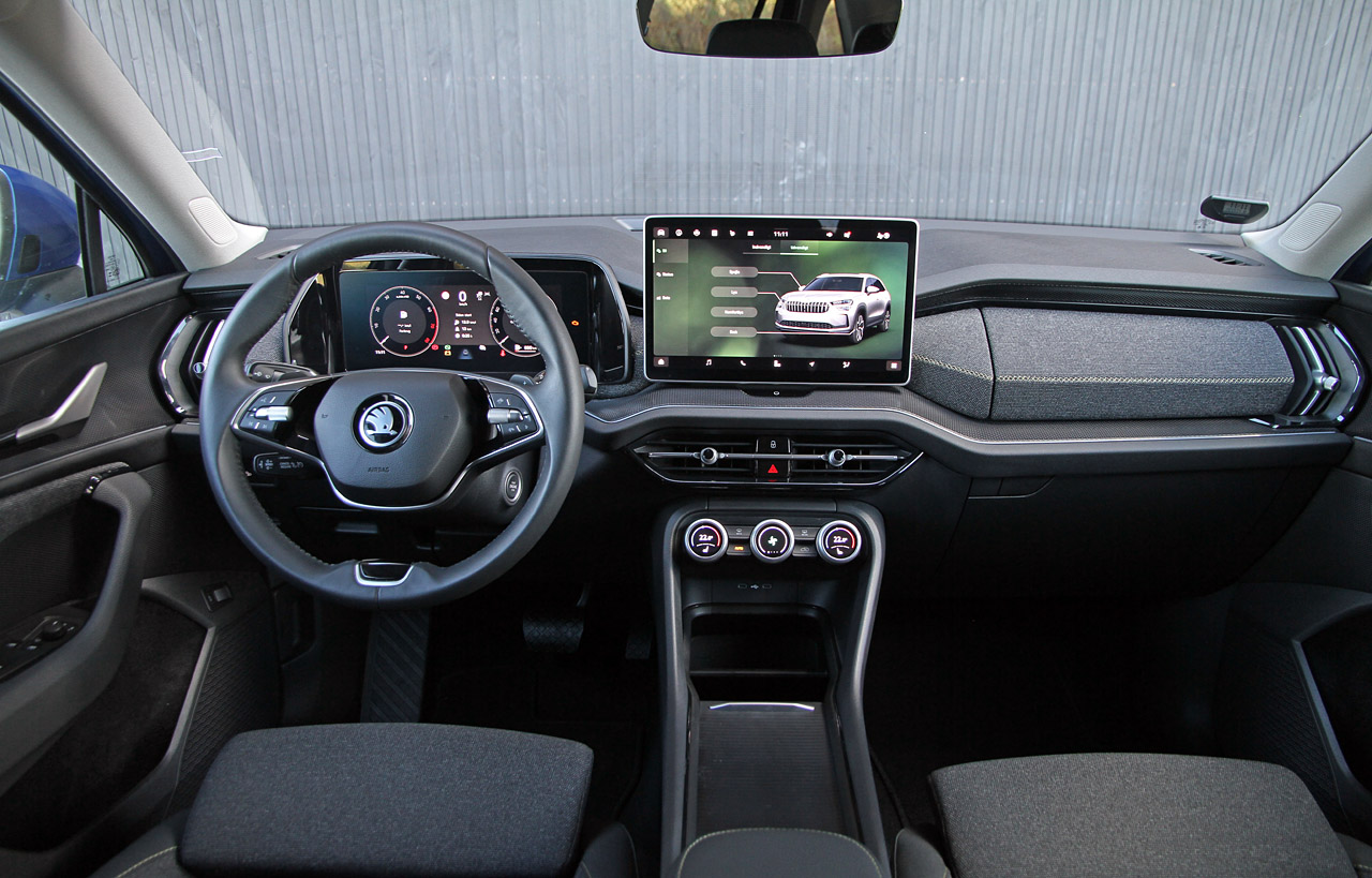 Som i VW-koncernens elbiler er næsten al betjening flyttet over på en 13-tommers central infotainmentskærm. Sammen med digital instrumentering giver det Kodiaq-kabinen et futuristisk præg. Betjeningen er dog på mange måder blevet mere besværlig. Du skal trykke og swipe dig gennem menuer på skærmen, hvilket kræver, at du tager blikket væk fra vejen. Heldigvis har Skoda nogle konventionelle tryk- og drejeknapper i rattet, der er lettere at arbejde med. Ventilation styres også med tre solide drejeknapper, der dog har flere dobbeltfunktioner. Først sent fandt vi ud af, at drejeknappen til blæserhastigheden også virker som volumekontrol af radioen, hvis du først trykker på den… På samme måde styrer du sædevarmen ved at trykke på drejeknapperne for lufttemperatur. Det kræver altså tilvænning eller god sælgerinstruktion for alvor at blive dus med Kodiaq.