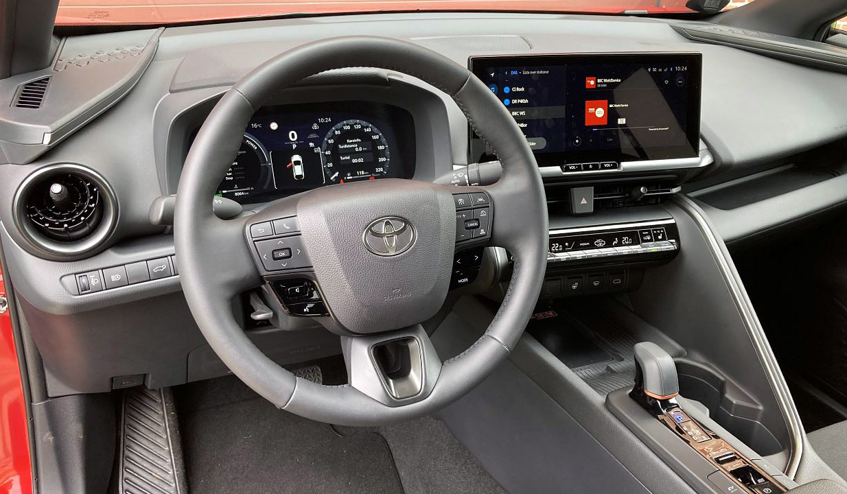 Toyota C-HR hører til mellem Yaris Cross og Corolla Cross, og den fås med Toyotas velkendte hybrid-drivlinjer. Med 1,8- eller 2,0-liters benzinmotor tilsat elmotor og trinløs CVT-gearkasse. Billigste C-HR Active koster 358.000 kroner og har stort set alt i både passivt og aktivt sikkerhedsudstyr og en solid portion komfortudstyr.