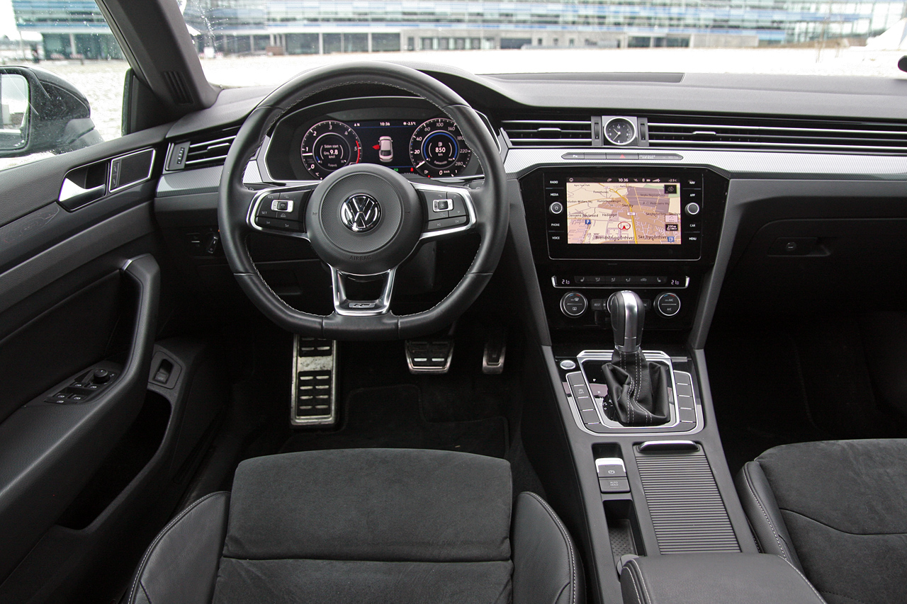 Mens Arteon har fået den store make-over udvendigt, er førerpladsen hentet direkte fra Passat. Det skal man ikke være ked af, for dermed får du både fin finish og en vellykket ergonomi, hvor du let finder det perfekte forhold mellem sæde, rat og pedaler. Især fordi Arteon er udstyret med et eljusterbart komfortførersæde på højde med Opels fine AGR-sæder. En hurtigt reagerende trykfølsom skærm bag glas – en lækker detalje for fingrene – er standard, men du skal betale ekstra for navigation. Fuld digital instrumentering er til gengæld standard. Omfanget af informationer er næsten overvældende, men high-tech stemningen passer fint til Arteons high-speed udstråling.