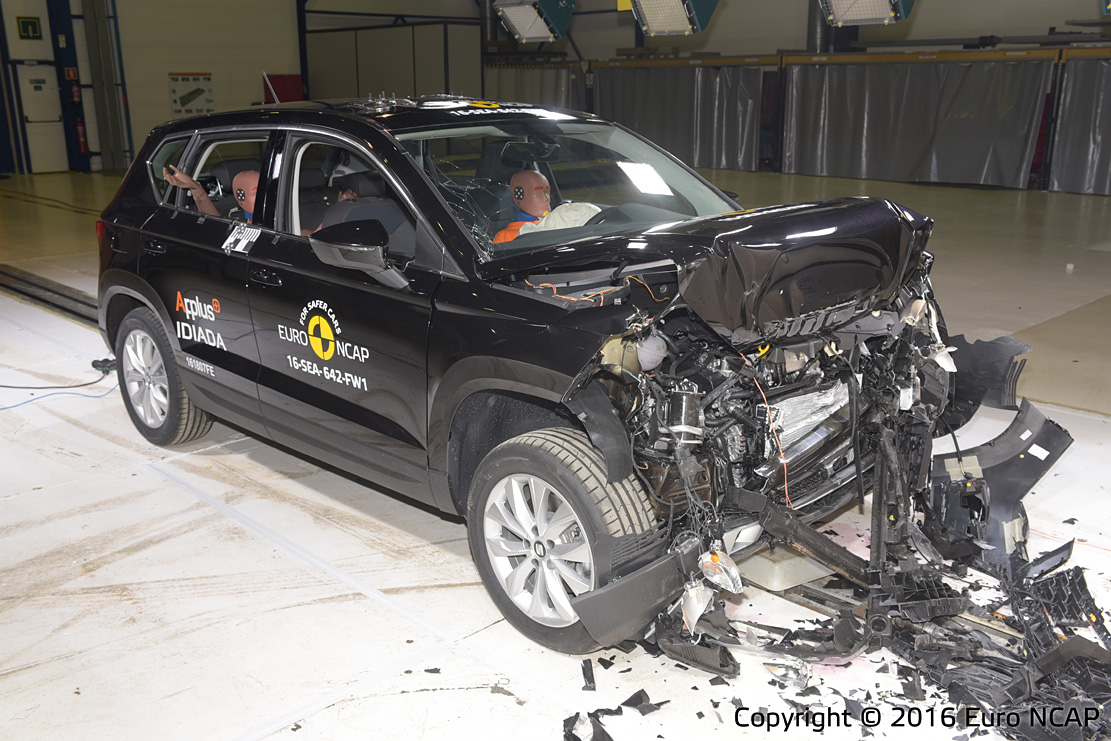 Men det er ikke bare AEB-bremserne, der udløser topkarakterer til de tre testede biler. Alfa Giulia samt søsterbilerne Seat Ateca (billedet) og VW Tiguan imponerer nemlig alle med usædvanligt god beskyttelse af passagererne i crashtesten. Uanset om bilerne rammer muren med 40 procent eller hele fronten eller bliver vædret fra siden, viser de sig at være usædvanligt sikre. Euro NCAP angiver sikkerheden for voksne passagerer til 93 pct. i Seat Ateca, 96 pct. i VW Tiguan og hele 98 pct. i Alfa Giulia.